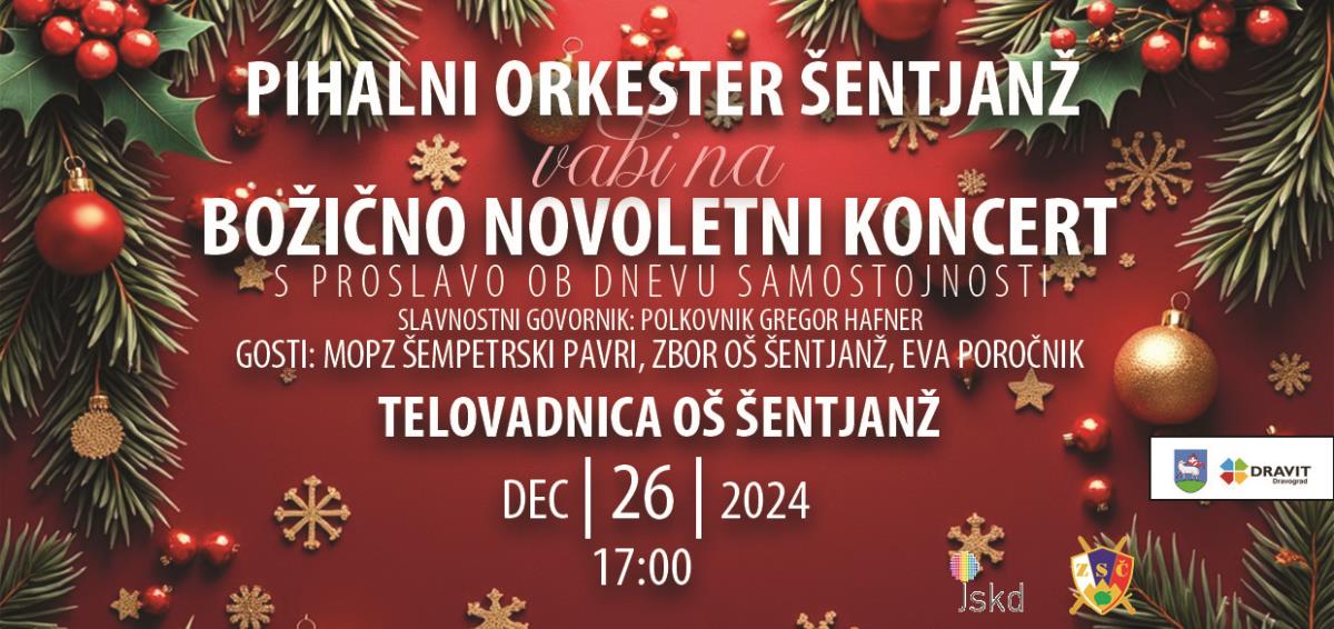 v prilogi se nahaja vabilo na Božično novoletni koncert Pihalnega orkestra Šentjanž pri Dravogradu, skupaj s proslavo ob dnevu samostojnosti in enotnosti, ki bo v četrtek, 26.decembra 2024 ob 17. uri, v telovadnici OŠ Šentjanž pri Dravogradu.